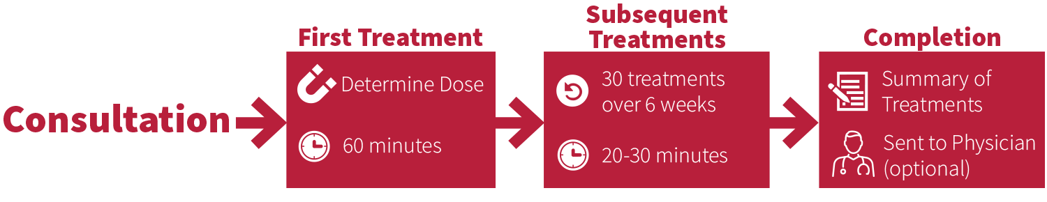 After five treatments, you will complete a 15-minute questionnaire to monitor progress, which your physician will review. The initial course typically involves 30 treatments over six weeks, followed by 6 tapering sessions over three weeks.